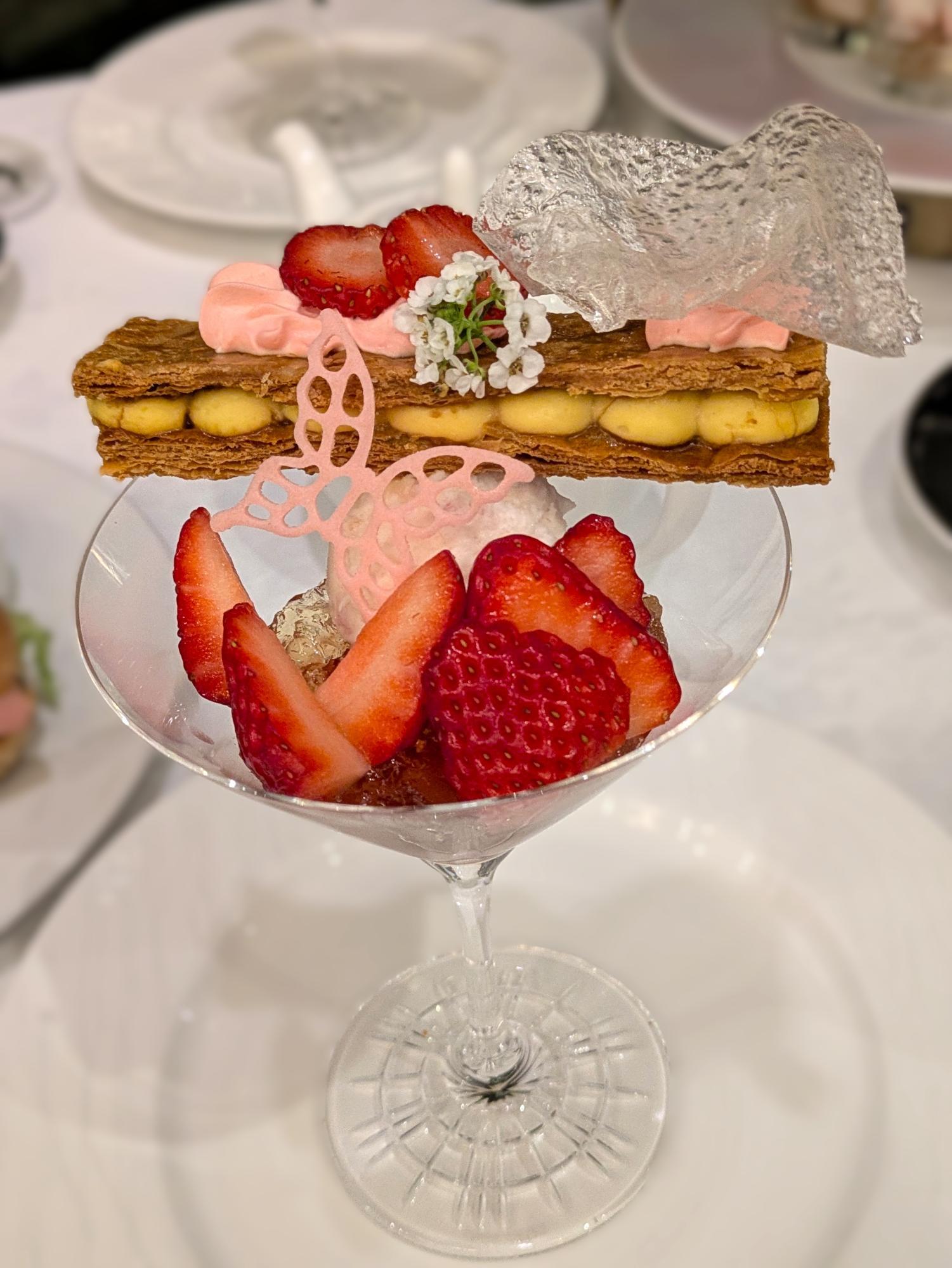 桜といちごのジュレ、シャンパンジュレに桜のミルクアイスを重ね、桜色の蝶の形のチュイールを飾ったミルフィーユ仕立てのパフェ。