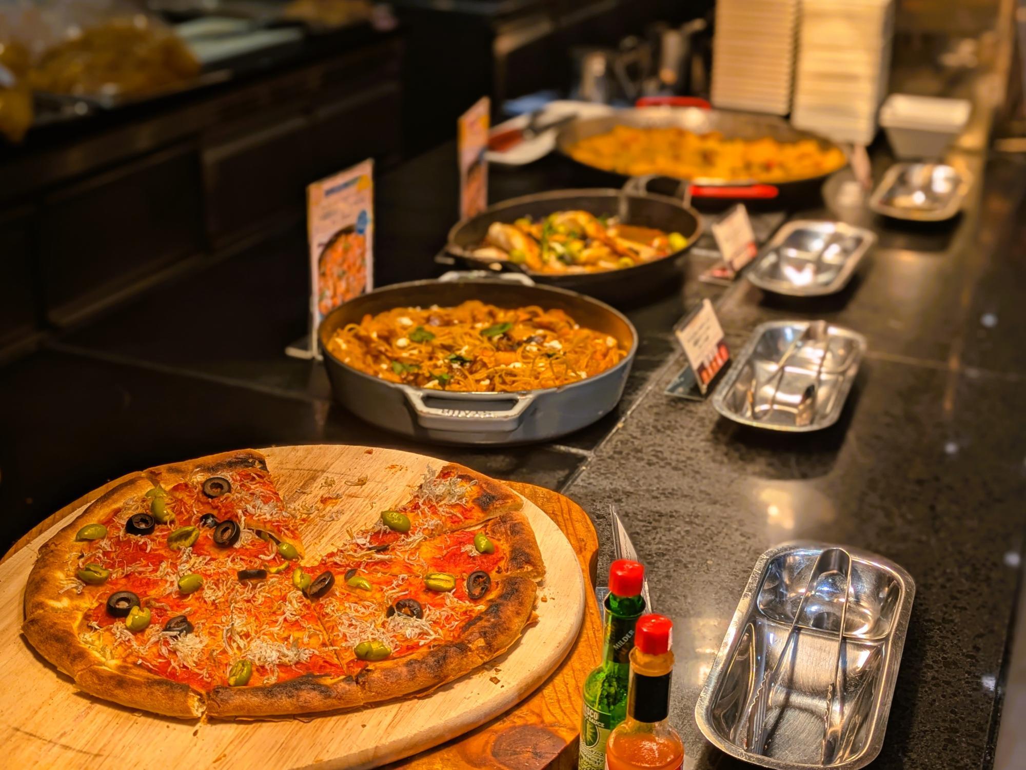 ブッフェ台には、「瀬戸内釜揚げしらすとオリーブのピッツァマリナーラ」や、彩り豊かなパスタなどがずらり。