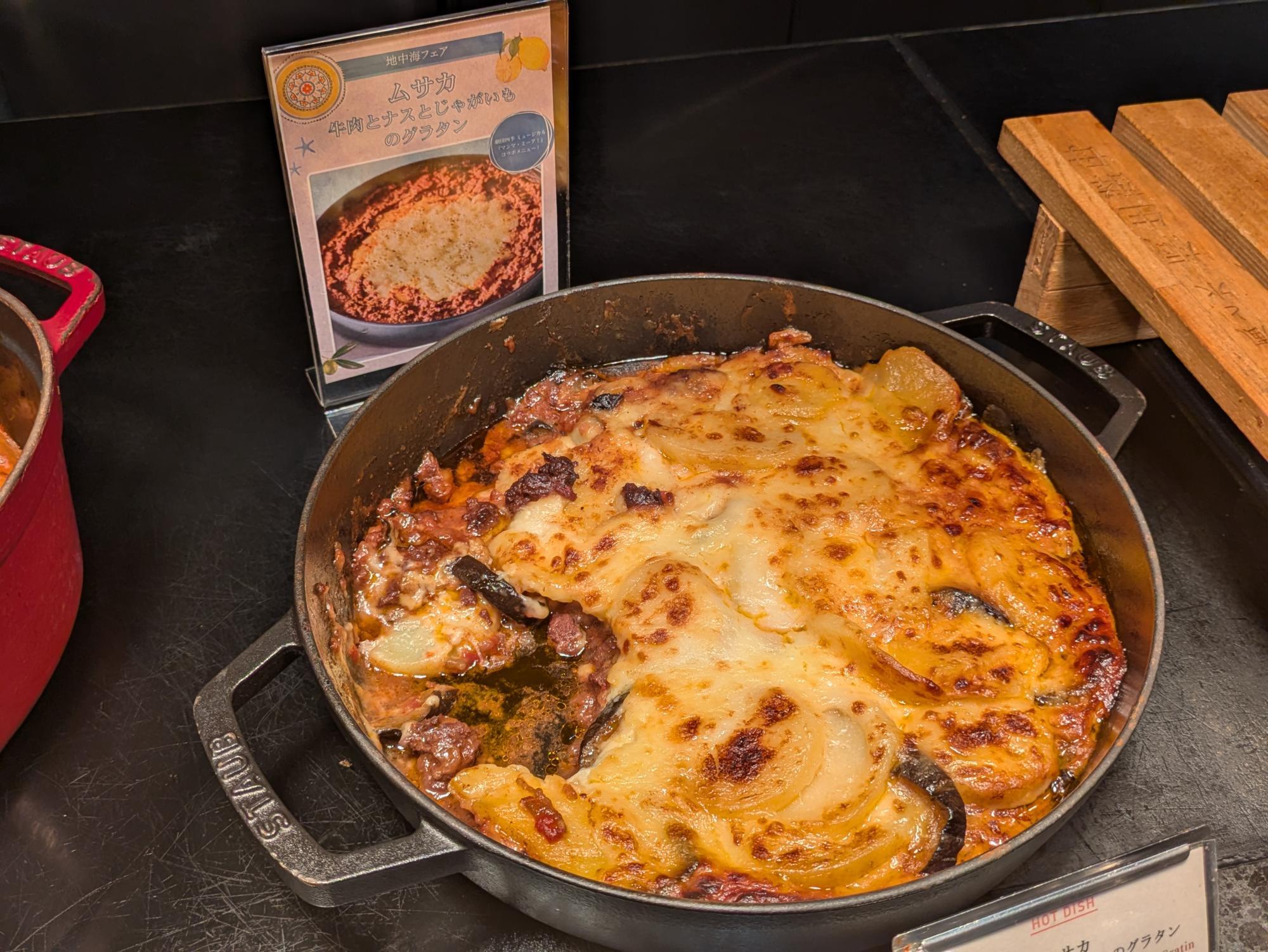 ギリシャの郷土料理「ムサカ」は、牛肉・ナス・じゃがいもを重ねて焼き上げた濃厚な一皿。ホワイトソースとチーズの香ばしさが食べる前から期待を高めてくれます。