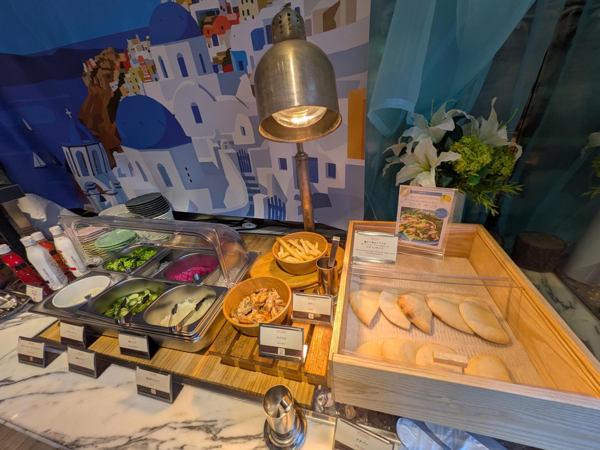 色とりどりの料理が並ぶブッフェ台には、ギリシャやイタリア、スペインなどの郷土料理をアレンジしたメニューがずらり。ライブキッチンからは、香ばしい香りが立ちのぼり、五感を刺激してくれます。