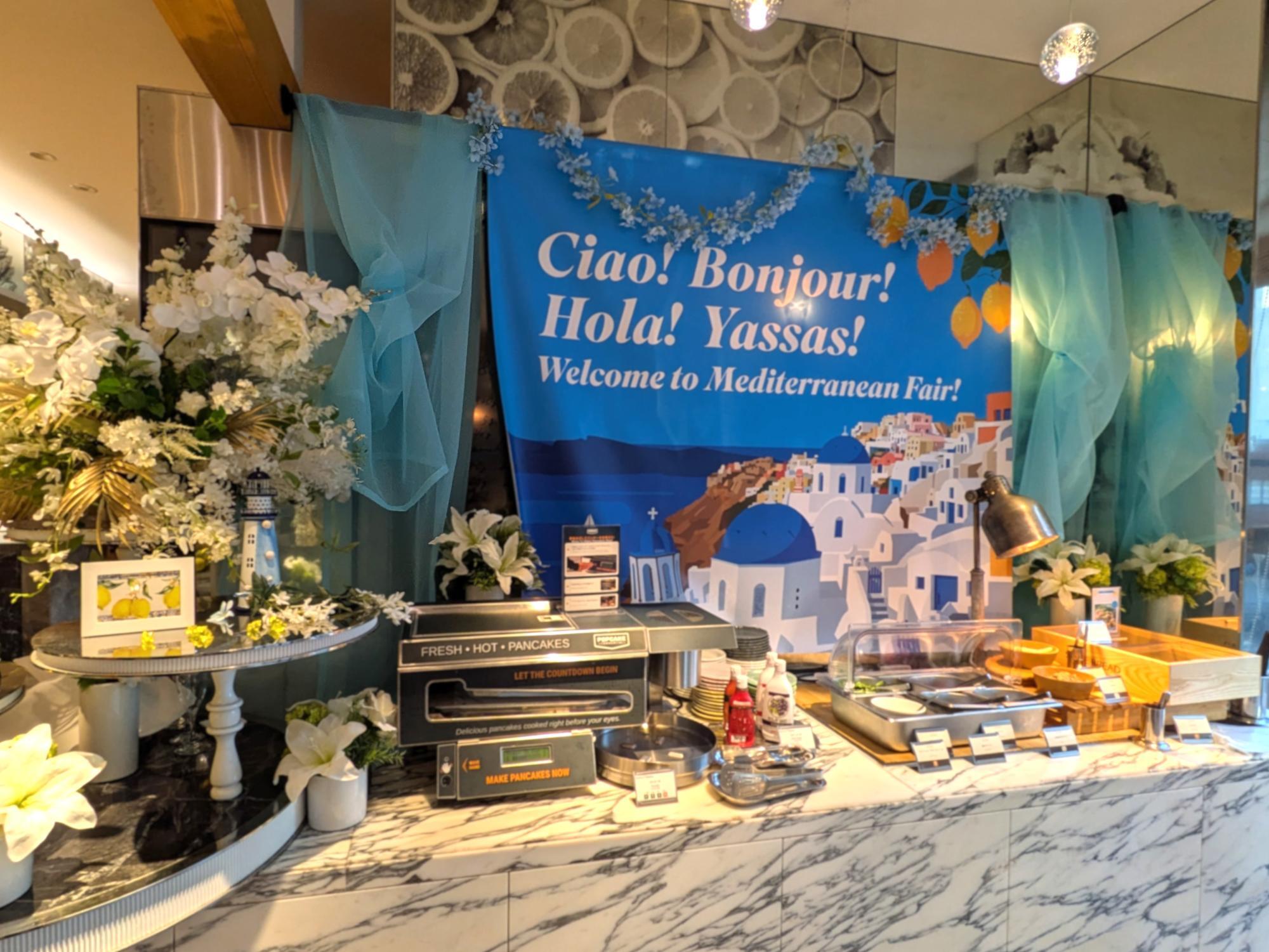 ホテル2階にある「シェフズ ライブ キッチン」に足を踏み入れると、まず目に飛び込んできたのは、2月23日(月)まで開催中の劇団四季ミュージカル『マンマ・ミーア!』とのコラボレーション装飾。カラフルで陽気な世界観が広がり、訪れた瞬間から気分が高まります。
