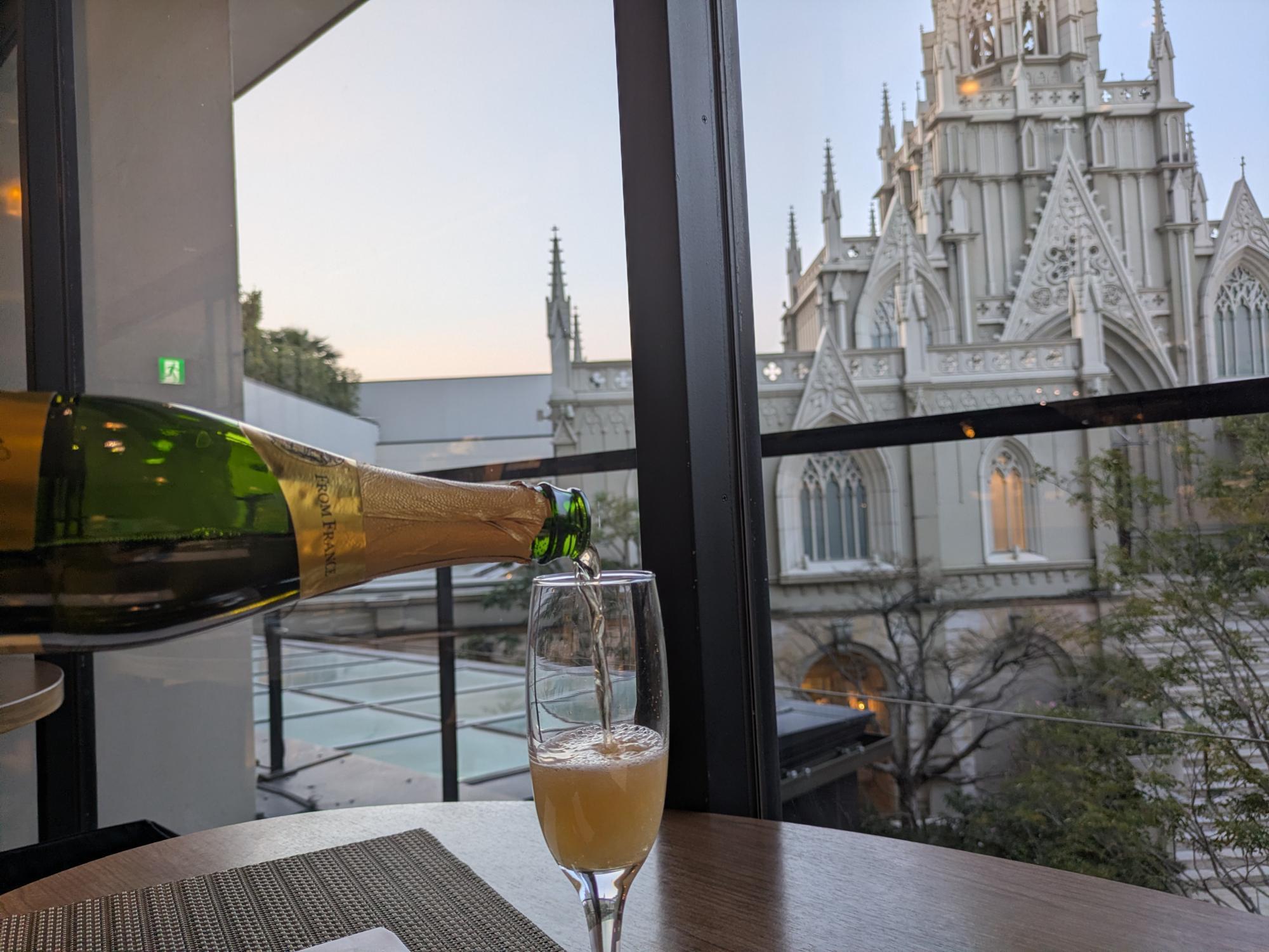 窓の外には、まるでヨーロッパを旅しているかのような大迫力の大聖堂が広がり、非日常の世界へと誘ってくれるよう。 シャンパンのきらめく泡と、荘厳な建物の美しさが重なり合い、まるで海外旅行をしているかのようなプチ贅沢気分を味わえます。