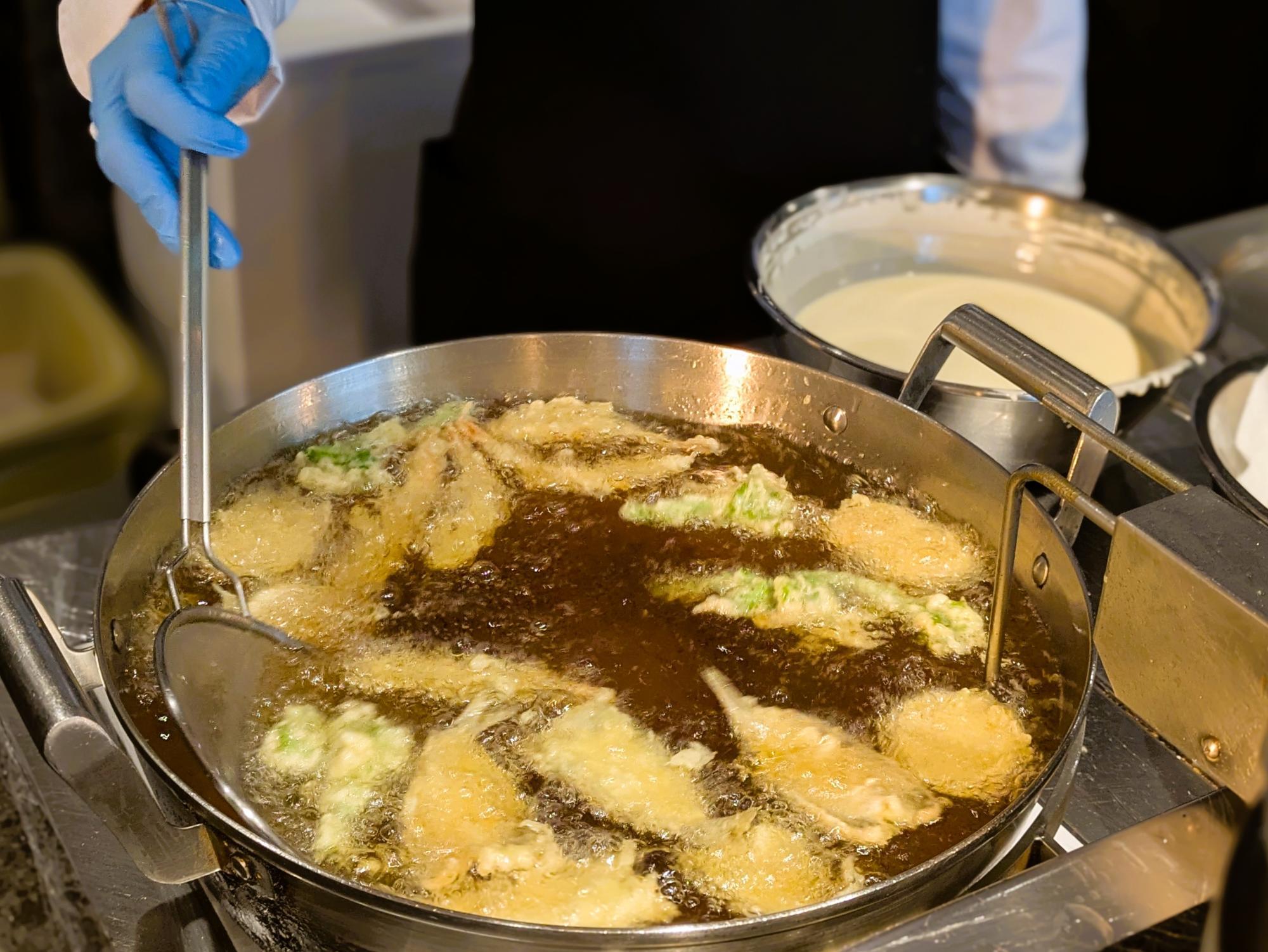 毎回必ずいただいてしまうのが、揚げたての天婦羅です。 ライブキッチンでは、目の前で職人の方が丁寧に衣をまとわせ、絶妙なタイミングで揚げてくれます。油の中でカラリと音を立てながら揚がっていく様子を眺めているだけで、食欲が刺激されます。