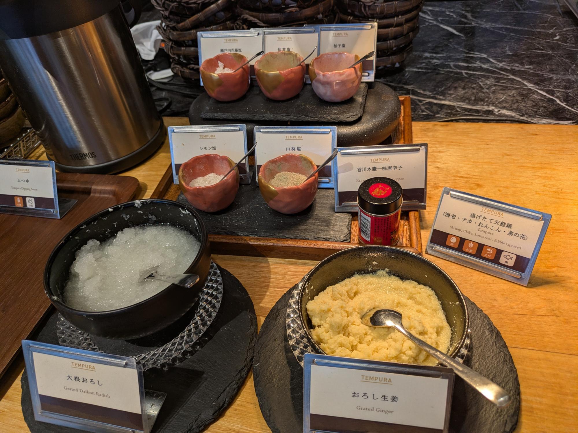 衣は軽やかでサクサク、中はふっくらとした仕上がりで、塩を少し添えるだけで素材の旨みが引き立ちます。 味わい方も実に多彩で、天つゆはもちろん、大根おろしやおろし生姜、レモン塩や瀬戸内花藻塩、香川本鷹一味唐辛子まで、好みに合わせて楽しめるのが嬉しいポイント。