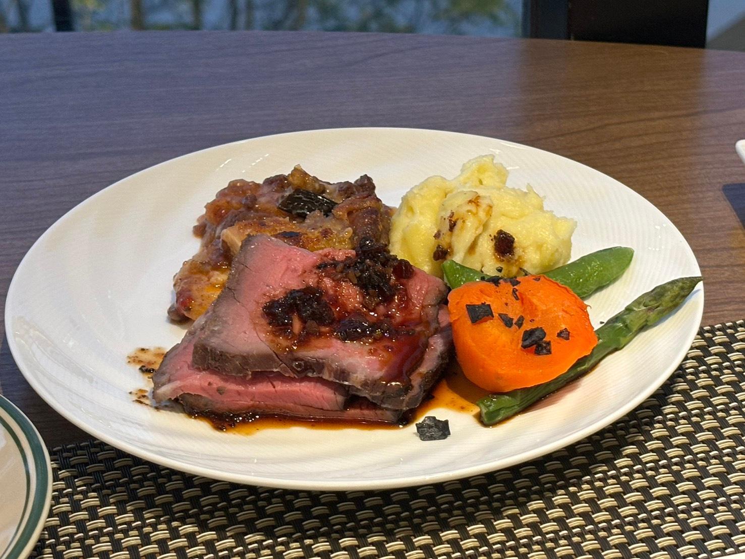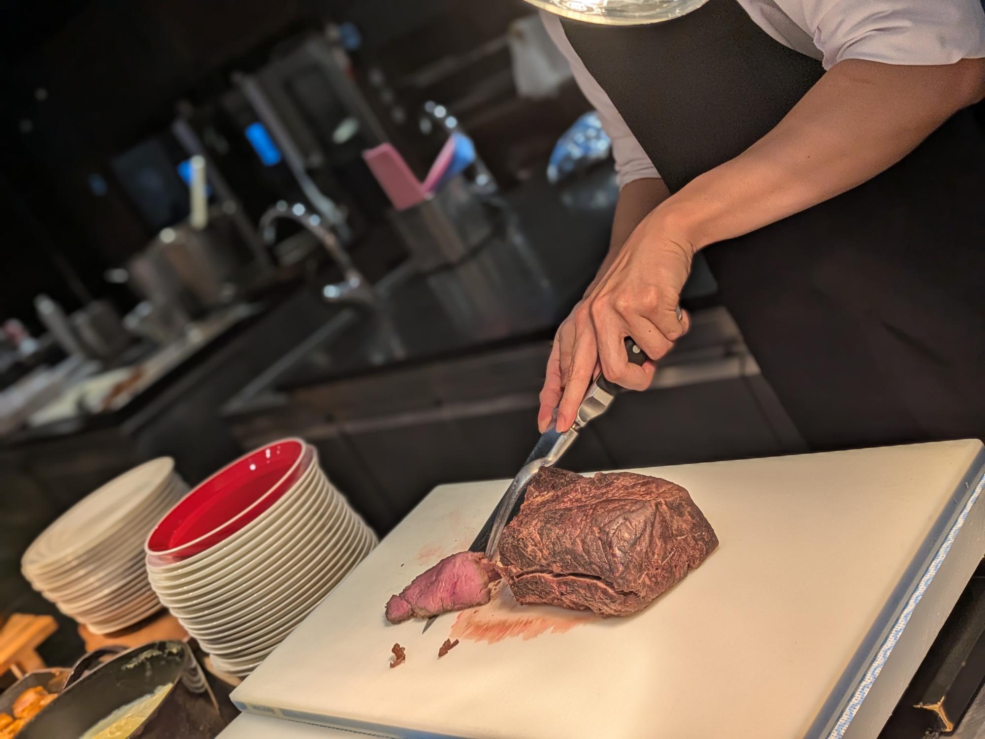 ストリングスホテル 名古屋のブッフェと言えば、やはりライブキッチンで提供されるローストビーフは外せません。目の前でシェフが丁寧に切り分けてくれるローストビーフは、毎回楽しみにしている定番メニュー。