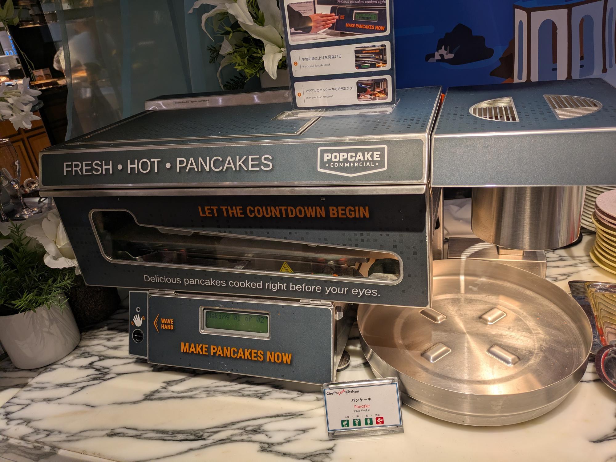 スイーツコーナーでひときわ目を引いたのが、今回新登場した「自動ホットケーキ焼き機」。 手をかざすと、機械の中で生地が焼かれ、数十秒後にはふんわりとしたホットケーキがトレーにポンッと出てくる仕組みです。