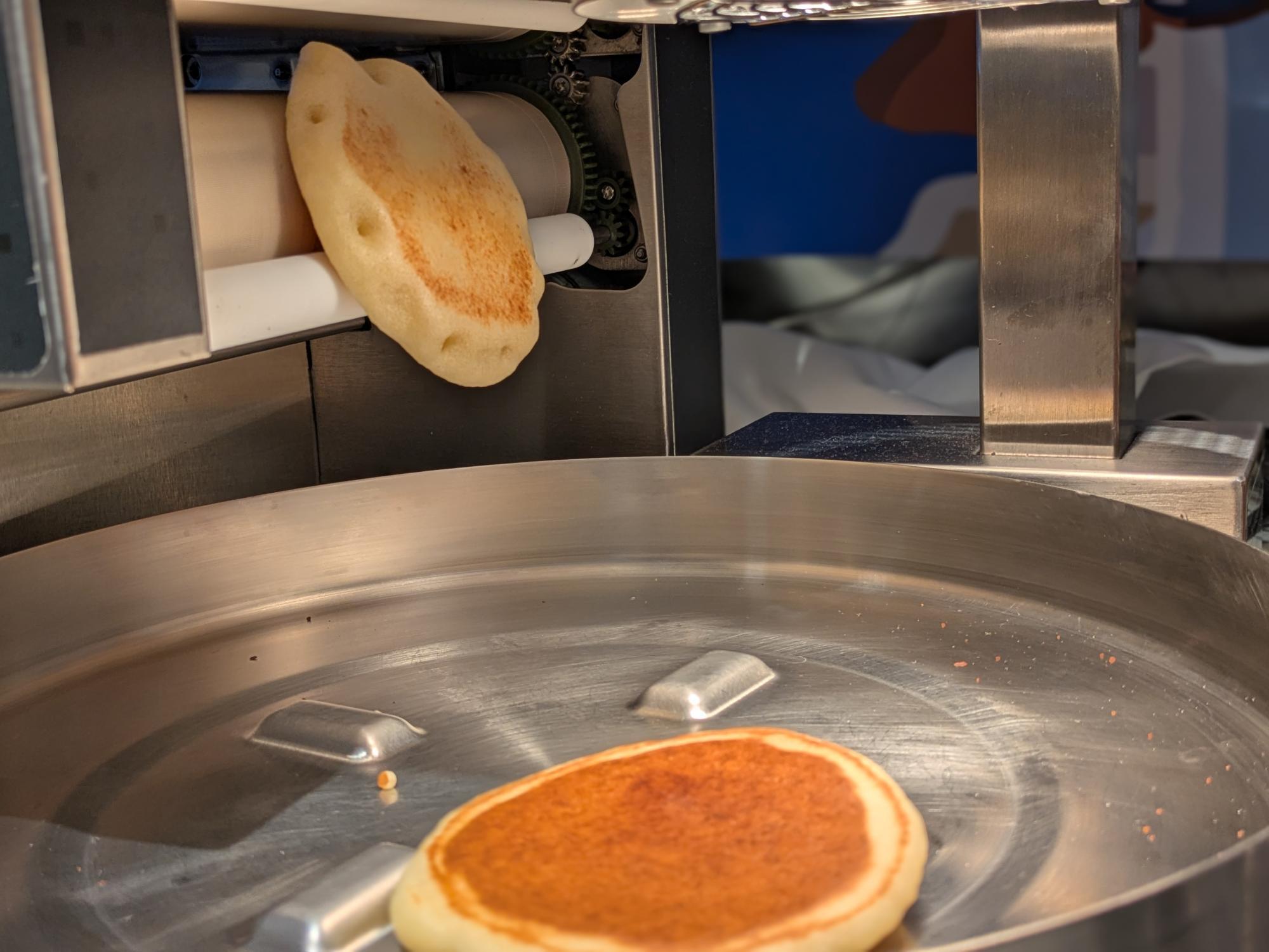 まるでアトラクションのような楽しさに、大人も子どもも思わず笑顔に。 機械の中で生地がくるくると焼かれていく様子をのぞき込むだけでもワクワクが止まりません。 やがて、焼きたてのパンケーキが目の前にコロンと転がって、トレーに落ちて完成。