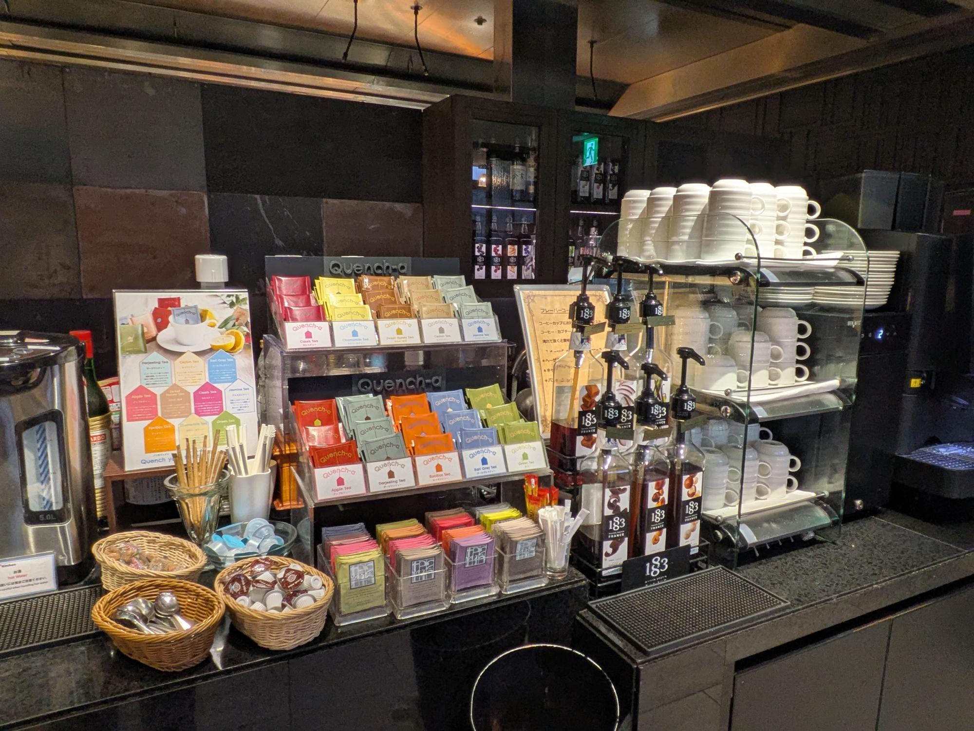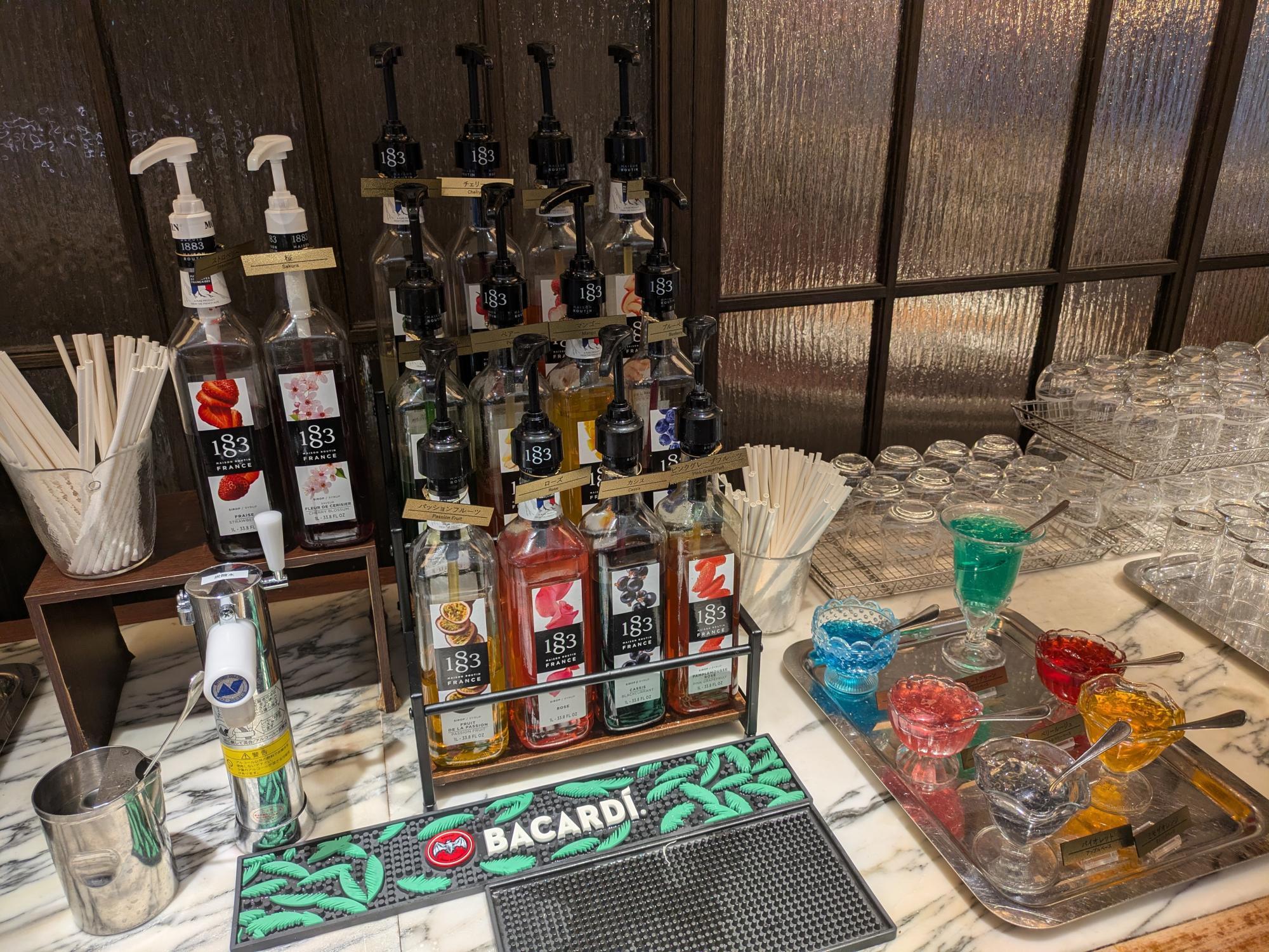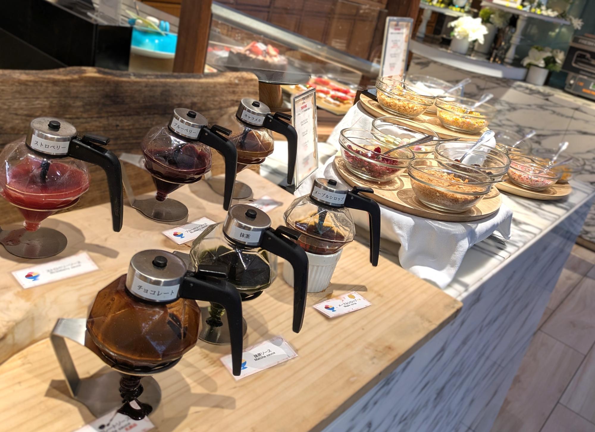 さらに注目したいのが、セルフで楽しめる「オリジナルドリンクコーナー」。 ストロベリーやカシス、桜などのシロップに、カラフルなゼリーやフルーツトッピングを組み合わせて、自分だけの一杯を作ることができます。 見た目も味わいも自由自在で、まるでカクテルを作るようなワクワク感。お子さまから大人まで、思わず夢中になってしまう人気のコーナーです。