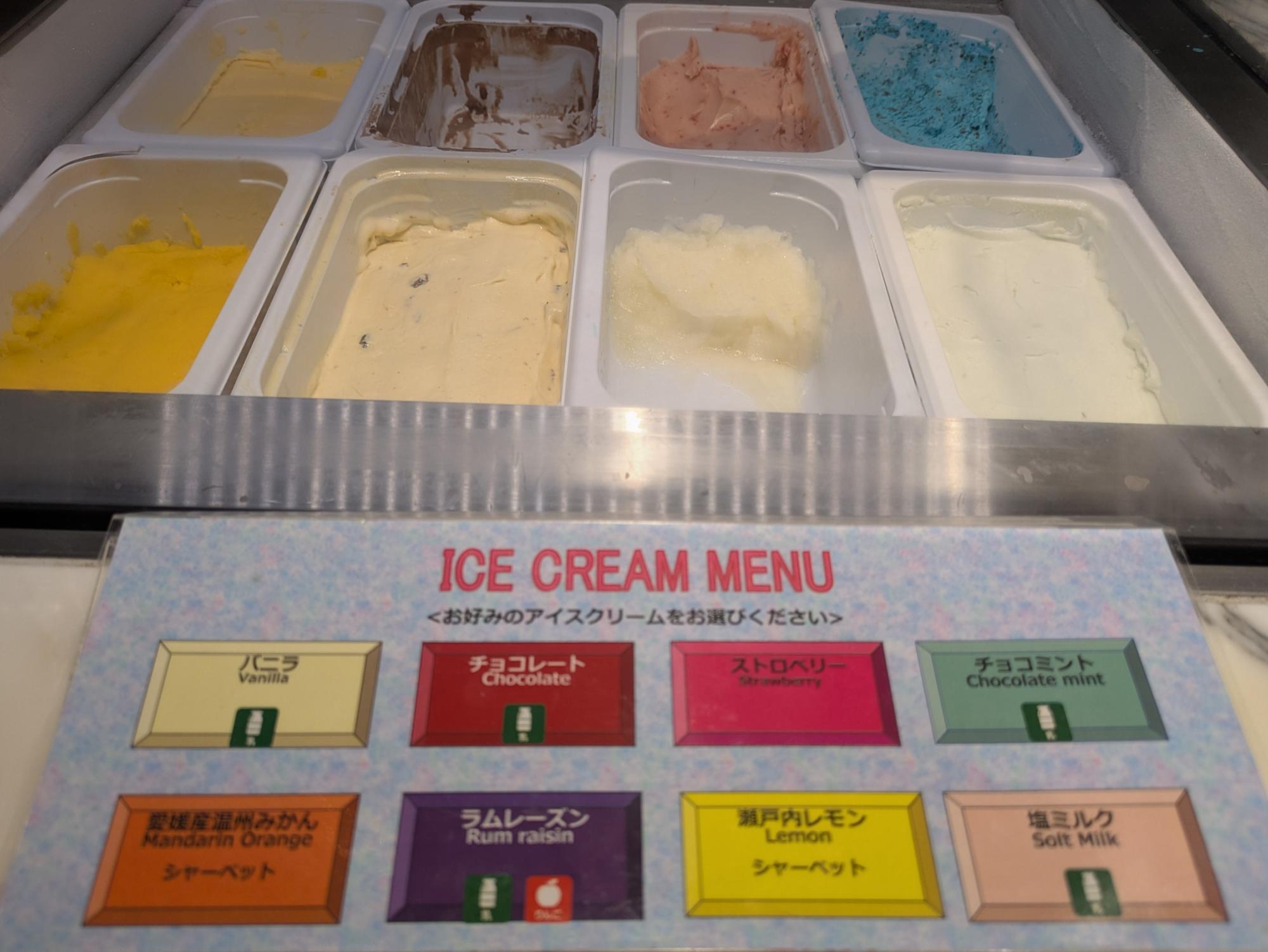 バニラやチョコレート、ストロベリーといった定番に加え、愛媛産温州みかんや瀬戸内レモンのシャーベット、塩ミルク、ラムレーズンなど、個性豊かなフレーバーがずらりと並びます。
