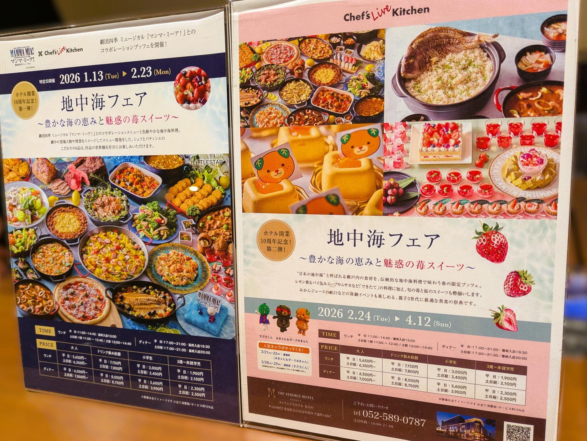 ストリングスホテル 名古屋のブッフェレストラン「シェフズ ライブ キッチン」で開催中の『地中海フェア~豊かな海の恵みと魅惑の苺スイーツ~第一弾』。ホテル開業10周年を記念した特別フェアを体験してきました。地中海の伝統料理と旬の苺スイーツが織りなす、華やかで贅沢なひとときをご紹介します。