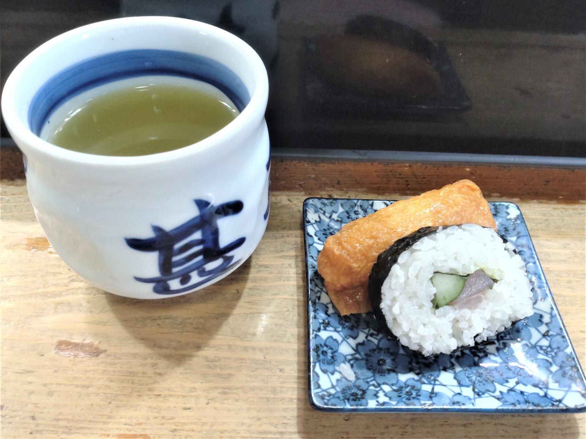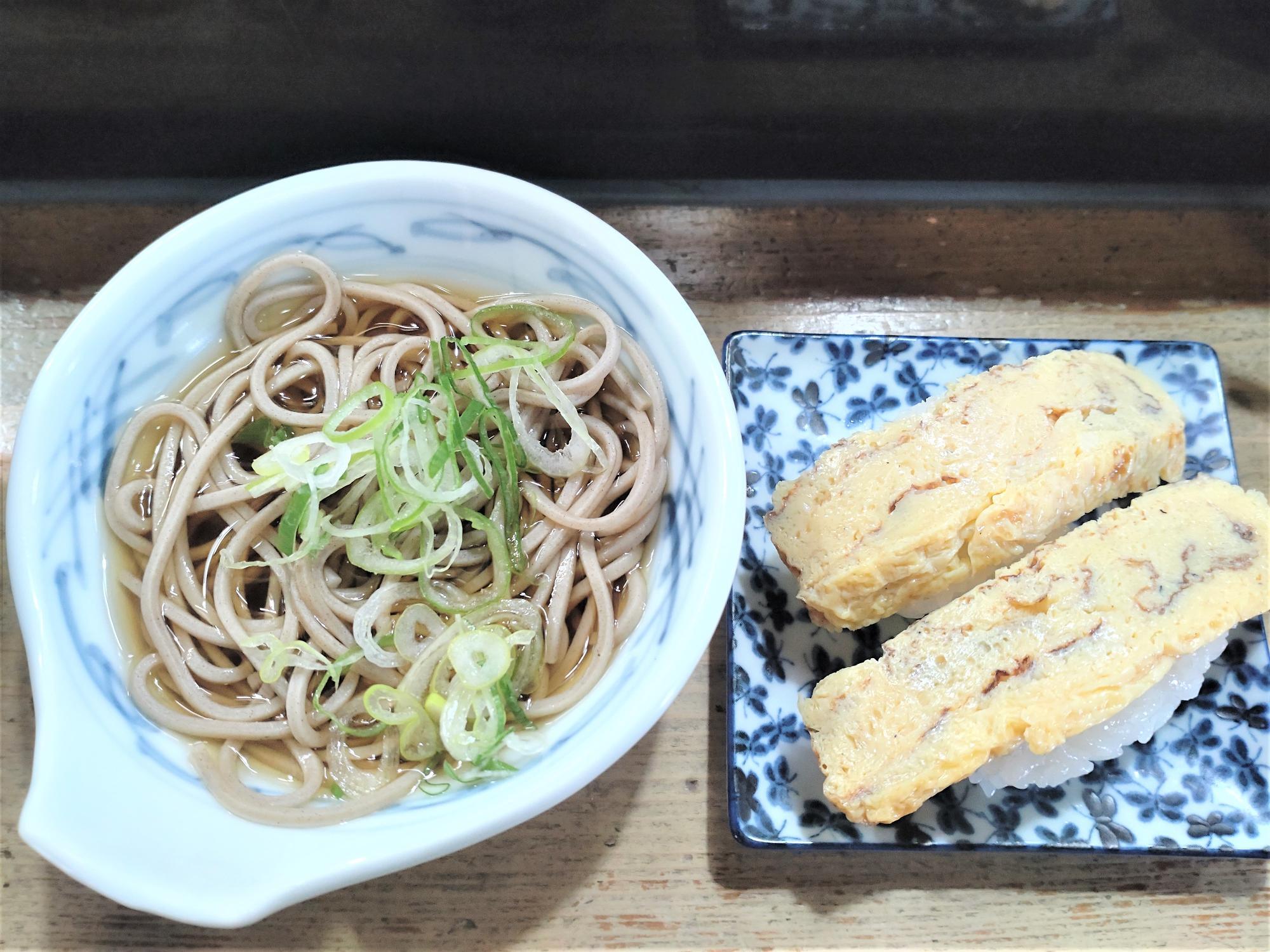 まだ、一皿目を食べ終わらないうちに、次の小鉢のお蕎麦と卵焼きのお寿司が出てきました。